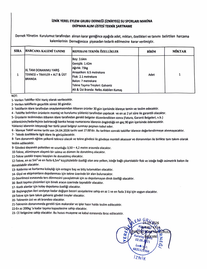 Dernek Yönetim Kurulumuz tarafından alınan karar gereğince aşağıda adet, miktarı, özellikleri ve tanımı belirtilen harcama